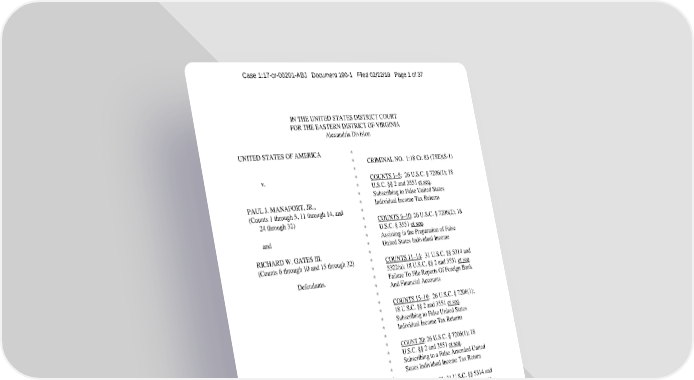 2 * * * * * * * * * * * * * * * * * * * * * * * * * * * COUNT 26: 18 U.S.C. §§ 1349 and 3551 et seq . Bank Fraud Conspiracy COUNT S 27: 18 U.S.C. §§ 1344, 2, and 3551 et seq . Bank Fraud COUNT 28–29: 18 U.S.C. §§ 1349 and 3551 et seq . Bank Fraud Conspiracy COUNT 30: 18 U.S.C. §§ 1344, 2, and 3551 et seq . Bank Fraud COUNT 31: 18 U.S.C. §§ 1349 and 3551 et seq . Bank Fraud Conspiracy COUNT 32: 18 U.S.C. §§ 1344, 2, and 3551 et seq . Bank Fraud FORFEITURE NOTICE ******* SUPERSEDING INDICTMENT February 2018 Term – At Alexandria, Virginia THE GRAND JURY CHARGES THAT : Introduction At all times relevant to this Superseding Indictment: 1. Defendant s PAUL J. MANAFORT, JR. (MANAFORT) and RICHARD W. GATES III (GATES) served for years as political consultant s and lobbyist s. B etween at least 2006 and 2015, Case 1:17-cr-00201-ABJ Document 190-1 Filed 02/22/18 Page 2 of 37