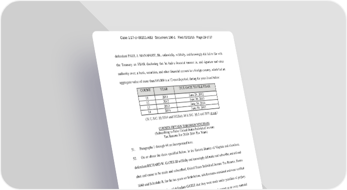 Case 1:17-cr-00201-ABJ Document 190-1 Filed 02/22/18 Page 29 of 37 defendant PAUL J. MANAFORT, JR., unlawfully, willfully, and knowingly did fail to file with the Treasury an FBAR disclosing that he had a financial interest in, and signature and other authority over, a bank, securities, and other financial account in a foreign country, which had an aggregate value of more than $10,000 in a 12-month period, during the years listed below: COUNT YEAR DUE DATE TO FILE FBAR 11 2011 June 29, 2012 12 2012 June 30, 2013 13 2013 June 30, 2014 14 2014 June 30, 2015 (31 U.S.C. §§ 5314 and 5322(a); 18 U.S.C. §§ 2 and 3551 et seq.) COUNTS FIFTEEN THROUGH NINETEEN (Subscribing to False United States Individual Income Tax Returns For 2010–2014 Tax Years) 51. Paragraphs 1 through 44 are incorporated here. 52. On or about the dates specified below, in the Eastern District of Virginia and elsewhere, defendant RICHARD W. GATES III willfully and knowingly did make and subscribe, and aid and abet and cause to be made and subscribed, United States Individual Income Tax Returns, Forms 1040 and Schedule B, for the tax years set forth below, which returns contained and were verified by the written declaration of defendant GATES that they were made under penalties of perjury, and which returns defendant GATES did not believe to be true and correct as to every material matter, in that the returns (a) claimed that GATES did not have a financial interest in, and signature and other authority over, a financial account in a foreign country and (b) failed to report income, whereas GATES then and there well knew and believed that he had a financial interest in, and signature and other authority over, a financial account in a foreign country and had earned total income in excess of the reported amounts noted below: 29