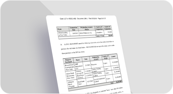 Case 1:17-cr-00201-ABJ Document 190-1 Filed 02/22/18 Page 15 of 37 Payee Transaction Originating Account Country of Amount of Date Holder Origination Transaction (Housekeeping 10/9/2013 Global Endeavour Inc. Grenadines $10,000 in New York) Vendor S Total $20,000 16. In 2012, MANAFORT caused the following wires to be sent to the entities listed below to purchase the real estate also listed below. MANAFORT did not report the money used to make these purchases on his 2012 tax return. Property Payee Date Originating Country of Amount Purchased Account Origin Howard Street DMP Condominium International 2/1/2012 Peranova Cyprus $1,500,000 (New York) LLC Union Street Attorney 11/29/2012 Actinet Trading Cyprus $1,800,000 Brownstone, Account Of Limited (New York) [Real Estate 11/29/2012 Actinet Trading Cyprus $1,200,000 Attorney] Limited Arlington Real Estate Lucicle Consultants House Trust 8/31/2012 Limited Cyprus $1,900,000 (Virginia) Total $6,400,000 17. MANAFORT and GATES also disguised, as purported “loans,” more than $10 million transferred from Cypriot entities, including the overseas MANAFORT–GATES entities, to domestic entities owned by MANAFORT. For example, a $1.5 million wire from Peranova to DMI that MANAFORT used to purchase real estate on Howard Street in Manhattan, New York, was recorded as a “loan” from Peranova to DMI, rather than as income. The following loans were shams designed to reduce fraudulently MANAFORT’s reported taxable income. 15