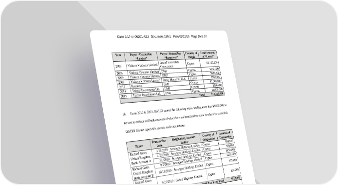 Case 1:17-cr-00201-ABJ Document 190-1 Filed 02/22/18 Page 16 of 37 Year Payor / Ostensible Payee / Ostensible Country of Total Amount “Lender” “Borrower” Origin of “Loans” 2008 Yiakora Ventures Limited Jesand Investment Cyprus $8,120,000 Corporation 2008 Yiakora Ventures Limited DMP Cyprus $500,000 2009 Yiakora Ventures Limited DMP Cyprus $694,000 2009 Yiakora Ventures Limited Daisy Manafort, LLC Cyprus $500,000 2012 Peranova DMI Cyprus $1,500,000 2014 Telmar Investments Ltd. DMI Cyprus $900,000 2015 Telmar Investments Ltd. DMI Cyprus $1,000,000 Total $13,214,000 18. From 2010 to 2014, GATES caused the following wires, totaling more than $3,000,000, to be sent to entities and bank accounts of which he was a beneficial owner or he otherwise controlled. GATES did not report this income on his tax returns. Payee Transaction Originating Account Country of Amount of Date Holder Origination Transaction Richard Gates 3/26/2010 Serangon Holdings Limited Cyprus $85,000 United Kingdom 4/20/2010 Serangon Holdings Limited Cyprus $50,000 Bank Account A 5/6/2010 Serangon Holdings Limited Cyprus $150,000 Richard Gates 9/7/2010 Serangon Holdings Limited Cyprus $160,000 United Kingdom 10/13/2010 Serangon Holdings Limited Cyprus $15,000 Bank Account B Richard Gates United States 9/27/2010 Global Highway Limited Cyprus $50,000 Bank Account C 2010 Tax Year Total $510,000 Jemina LLC United States 9/9/2011 Peranova Cyprus $48,500 Bank Account D Richard Gates United Kingdom 12/16/2011 Peranova Cyprus $100,435 Bank Account B 2011 Tax Year Total $148,935 Richard Gates 1/9/2012 Global Highway Limited Cyprus $100,000 United Kingdom 1/13/2012 Peranova Cyprus $100,435 Bank Account B 2/29/2012 Global Highway Limited Cyprus $28,500 3/27/2012 Bletilla Ventures Limited Cyprus $18,745 16
