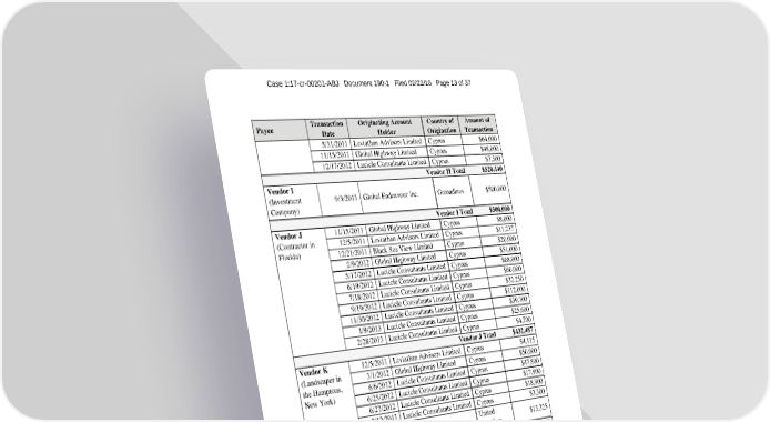 Case 1:17-cr-00201-ABJ Document 190-1 Filed 02/22/18 Page 13 of 37 Payee Transaction Originating Account Country of Amount of Date Holder Origination Transaction 5/31/2011 Leviathan Advisors Limited Cyprus $64,000 11/15/2011 Global Highway Limited Cyprus $48,000 12/17/2012 Lucicle Consultants Limited Cyprus $7,500 Vendor H Total $520,440 Vendor I (Investment 9/3/2013 Global Endeavour Inc. Grenadines $500,000 Company) Vendor I Total $500,000 Vendor J 11/15/2011 Global Highway Limited Cyprus $8,000 (Contractor in 12/5/2011 Leviathan Advisors Limited Cyprus $11,237 Florida) 12/21/2011 Black Sea View Limited Cyprus $20,000 2/9/2012 Global Highway Limited Cyprus $51,000 5/17/2012 Lucicle Consultants Limited Cyprus $68,000 6/19/2012 Lucicle Consultants Limited Cyprus $60,000 7/18/2012 Lucicle Consultants Limited Cyprus $32,250 9/19/2012 Lucicle Consultants Limited Cyprus $112,000 11/30/2012 Lucicle Consultants Limited Cyprus $39,700 1/9/2013 Lucicle Consultants Limited Cyprus $25,600 2/28/2013 Lucicle Consultants Limited Cyprus $4,700 Vendor J Total $432,487 Vendor K 12/5/2011 Leviathan Advisors Limited Cyprus $4,115 (Landscaper in 3/1/2012 Global Highway Limited Cyprus $50,000 the Hamptons, 6/6/2012 Lucicle Consultants Limited Cyprus $47,800 New York) 6/25/2012 Lucicle Consultants Limited Cyprus $17,900 6/27/2012 Lucicle Consultants Limited Cyprus $18,900 2/12/2013 Lucicle Consultants Limited Cyprus $3,300 7/15/2013 Pompolo Limited United $13,325 Kingdom 11/26/2013 Global Endeavour Inc. Grenadines $9,400 Vendor K Total $164,740 Vendor L 4/12/2012 Lucicle Consultants Limited Cyprus $83,525 (Payments 5/2/2012 Lucicle Consultants Limited Cyprus $12,525 Relating to Three 6/29/2012 Lucicle Consultants Limited Cyprus $67,655 Range Rovers) Vendor L Total $163,705 Vendor M 11/20/2012 Lucicle Consultants Limited Cyprus $45,000 12/7/2012 Lucicle Consultants Limited Cyprus $21,000 13