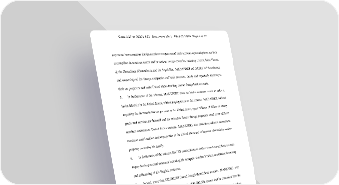 Case 1:17-cr-00201-ABJ Document 190-1 Filed 02/22/18 Page 4 of 37 payments into numerous foreign nominee companies and bank accounts, opened by them and their accomplices in nominee names and in various foreign countries, including Cyprus, Saint Vincent & the Grenadines (Grenadines), and the Seychelles. MANAFORT and GATES hid the existence and ownership of the foreign companies and bank accounts, falsely and repeatedly reporting to their tax preparers and to the United States that they had no foreign bank accounts. 5. In furtherance of the scheme, MANAFORT used his hidden overseas wealth to enjoy a lavish lifestyle in the United States, without paying taxes on that income. MANAFORT, without reporting the income to his tax preparer or the United States, spent millions of dollars on luxury goods and services for himself and his extended family through payments wired from offshore nominee accounts to United States vendors. MANAFORT also used these offshore accounts to purchase multi-million dollar properties in the United States and to improve substantially another property owned by his family. 6. In furtherance of the scheme, GATES used millions of dollars from these offshore accounts to pay for his personal expenses, including his mortgage, children’s tuition, and interior decorating and refinancing of his Virginia residence. 7. In total, more than $75,000,000 flowed through the offshore accounts. MANAFORT, with the assistance of GATES, laundered more than $30,000,000, income that he concealed from the United States Department of the Treasury (Treasury), the Department of Justice, and others. GATES obtained more than $3,000,000 from the offshore accounts, income that he too concealed from the Treasury, the Department of Justice, and others. 4