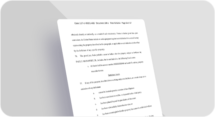 Case 1:17-cr-00201-ABJ Document 190-1 Filed 02/22/18 Page 36 of 37 obtained, directly or indirectly, as a result of such violation(s). Notice is further given that, upon conviction, the United States intends to seek a judgment against each defendant for a sum of money representing the property described in this paragraph, as applicable to each defendant (to be offset by the forfeiture of any specific property). 76. The grand jury finds probable cause to believe that the property subject to forfeiture by PAUL J. MANAFORT, JR., includes, but is not limited to, the following listed assets: a. All funds held in account number XXXXXX0969 at Lender D, and any property traceable thereto. Substitute Assets 77. If any of the property described above as being subject to forfeiture, as a result of any act or omission of any defendant a. cannot be located upon the exercise of due diligence; b. has been transferred or sold to, or deposited with, a third party; c. has been placed beyond the jurisdiction of the court; d. has been substantially diminished in value; or e. has been commingled with other property that cannot be subdivided without difficulty; it is the intent of the United States of America, pursuant to Title 18, United States Code, Section 982(b) and Title 28, United States Code, Section 2461(c), incorporating Title 21, United States Code, Section 853, to seek forfeiture of any other property of said defendant. (18 U.S.C. ยง 982) 36