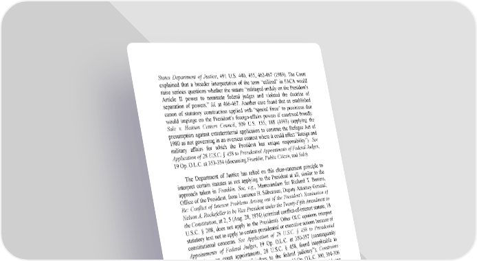 States Department of Justice, 491 U.S. 440, 455, 462-467 (1989). The Court explained that a broader interpretation of the term “utilized” in FACA would raise serious questions whether the statute “infringed unduly on the President’s Article II power to nominate federal judges and violated the doctrine of separation of powers.” Id. at 466-467. Another case found that an established canon of statutory construction applied with “special force” to provisions that would impinge on the President’s foreign-affairs powers if construed broadly. Sale v. Haitian Centers Council, 509 U.S. 155, 188 (1993) (applying the presumption against extraterritorial application to construe the Refugee Act of 1980 as not governing in an overseas context where it could affect “foreign and military affairs for which the President has unique responsibility”). See Application of 28 U.S.C. § 458 to Presidential Appointments of Federal Judges, 19 Op. O.L.C. at 353-354 (discussing Franklin, Public Citizen, and Sale). The Department of Justice has relied on this clear-statement principle to interpret certain statutes as not applying to the President at all, similar to the approach taken in Franklin. See, e.g., Memorandum for Richard T. Burress, Office of the President, from Laurence H. Silberman, Deputy Attorney General, Re: Conflict of Interest Problems Arising out of the President’s Nomination of Nelson A. Rockefeller to be Vice President under the Twenty-Fifth Amendment to the Constitution, at 2, 5 (Aug. 28, 1974) (criminal conflict-of-interest statute, 18 U.S.C. § 208, does not apply to the President). Other OLC opinions interpret statutory text not to apply to certain presidential or executive actions because of constitutional concerns. See Application of 28 U.S.C. § 458 to Presidential Appointments of Federal Judges, 19 Op. O.L.C. at 350-357 (consanguinity limitations on court appointments, 28 U.S.C. § 458, found inapplicable to “presidential appointments of judges to the federal judiciary”); Constraints Imposed by 18 U.S.C. § 1913 on Lobbying Efforts, 13 Op. O.L.C. 300, 304-306 (1989) (limitation on the use of appropriated funds for certain lobbying programs found inapplicable to certain communications by the President and executive officials). But OLC has also recognized that this clear-statement rule “does not apply with respect to a statute that raises no separation of powers questions were it to be applied to the President,” such as the federal bribery statute, 18 U.S.C. § 201. Application of 28 U.S.C. § 458 to Presidential Appointments of Federal Judges, 19 Op. O.L.C. at 357 n.11. OLC explained that “[a]pplication of § 201 raises no separation of powers question, let alone a serious one,” because [t]he