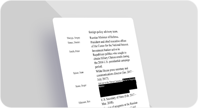 foreign policy advisory team. Shoygu, Sergey Russian Minister of Defense. Simes, Dimitri President and chief executive officer of the Center for the National Interest. Smith, Peter Investment banker active in Republican politics who sought to obtain Hillary Clinton emails during the 2016 U.S. presidential campaign period. Spicer, Sean White House press secretary and communications director (Jan. 2017 – July 2017). Stone, Roger Advisor to the Trump Campaign Harm to Ongoing Matter█ █ █ █ █ █ █ █ █ █ █ █ █ █ █ █ █ █ █ █ █ █ █ █ █ █ █ █ █ █ █ █ █ █ █ █ █ █ █ █ █ █ █ █ █ █ █ █ █ █ █ █ █ █ █ █ █ █ █ █ █ █ █ █ █ █ █ █ █ █ █ █ █ █ █ █ █ █ █ █ Tillerson, Rex U.S. Secretary of State (Feb. 2017 – Mar. 2018). Timofeev, Ivan Director of programs at the Russian International Affairs Council and program director of the Valdai Discussion Club who communicated in 2016 with George Papadopoulos, attempting to arrange a meeting between the Russian government and the Trump Campaign. Trump, Donald Jr.