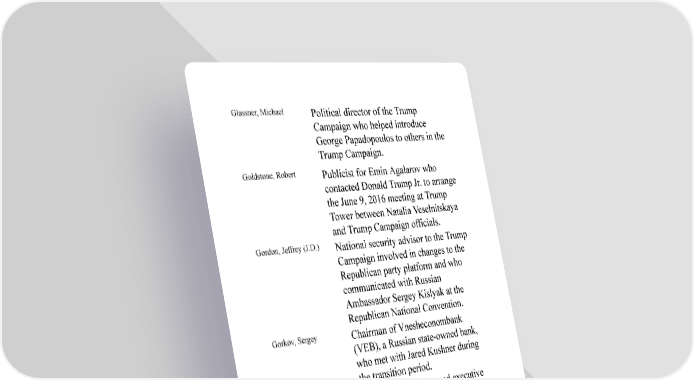 Glassner, Michael Political director of the Trump Campaign who helped introduce George Papadopoulos to others in the Trump Campaign. Goldstone, Robert Publicist for Emin Agalarov who contacted Donald Trump Jr. to arrange the June 9, 2016 meeting at Trump Tower between Natalia Veselnitskaya and Trump Campaign officials. Gordon, Jeffrey (J.D.) National security advisor to the Trump Campaign involved in changes to the Republican party platform and who communicated with Russian Ambassador Sergey Kislyak at the Republican National Convention. Gorkov, Sergey Chairman of Vnesheconombank (VEB), a Russian state-owned bank, who met with Jared Kushner during the transition period. Graff, Rhona Senior vice-president and executive assistant to Donald J. Trump at the Trump Organization. HOM█ █ █ Harm to Ongoing Matter█ █ █ █ █ █ █ █ █ █ █ █ █ █ █ █ █ █ █ █ █ █ █ █ █ █ █ █ █ █ █ █ █ █ █ █ █ █ █ █ █ █ █ █ █ █ █ █ █ █ █ █ █ █ █ █ █ █ █ █ █ █ █ █ █ █ █ █ █ █ █ █ █ █ █ █ █ █ █ █ Hawker, Jonathan Public relations consultant at FTI