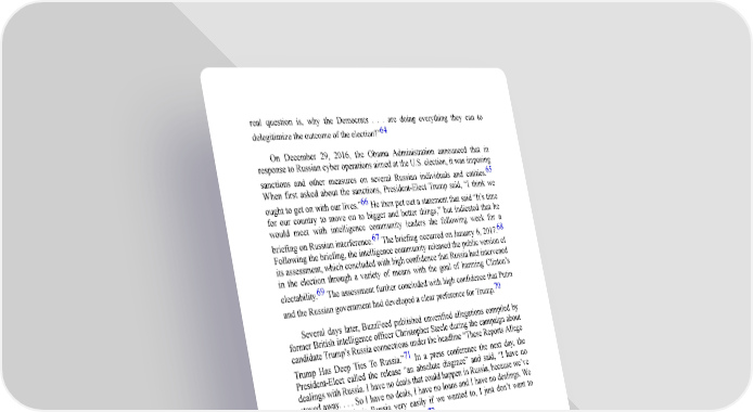 real question is, why the Democrats . . . are doing everything they can to 64 delegitimize the outcome of the election?” On December 29, 2016, the Obama Administration announced that in response to Russian cyber operations aimed at the U.S. election, it was imposing 65 sanctions and other measures on several Russian individuals and entities. When first asked about the sanctions, President-Elect Trump said, “I think we 66 ought to get on with our lives.” He then put out a statement that said “It’s time for our country to move on to bigger and better things,” but indicated that he would meet with intelligence community leaders the following week for a 67 68 briefing on Russian interference. The briefing occurred on January 6, 2017. Following the briefing, the intelligence community released the public version of its assessment, which concluded with high confidence that Russia had intervened in the election through a variety of means with the goal of harming Clinton’s 69 electability. The assessment further concluded with high confidence that Putin 70 and the Russian government had developed a clear preference for Trump. Several days later, BuzzFeed published unverified allegations compiled by former British intelligence officer Christopher Steele during the campaign about candidate Trump’s Russia connections under the headline “These Reports Allege 71 Trump Has Deep Ties To Russia.” In a press conference the next day, the President-Elect called the release “an absolute disgrace” and said, “I have no dealings with Russia. I have no deals that could happen in Russia, because we’ve stayed away. . . . So I have no deals, I have no loans and I have no dealings. We could make deals in Russia very easily if we wanted to, I just don’t want to 72 because I think that would be a conflict.” Several advisors recalled that the President-Elect viewed stories about his Russian connections, the Russia investigations, and the intelligence community assessment of Russian interference as a threat to the legitimacy of his electoral 73 victory. Hicks, for example, said that the President-Elect viewed the intelligence community assessment as his “Achilles heel” because, even if Russia had no impact on the election, people would think Russia helped him 74 win, taking away from what he had accomplished. Sean Spicer, the first White House communications director, recalled that the President thought the Russia 75 story was developed to undermine the legitimacy of his election. Gates said