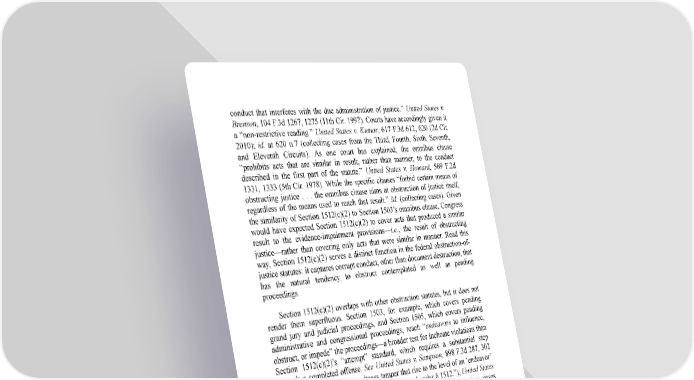 conduct that interferes with the due administration of justice.” United States v. Brenson, 104 F.3d 1267, 1275 (11th Cir. 1997). Courts have accordingly given it a “non-restrictive reading.” United States v. Kumar, 617 F.3d 612, 620 (2d Cir. 2010); id. at 620 n.7 (collecting cases from the Third, Fourth, Sixth, Seventh, and Eleventh Circuits). As one court has explained, the omnibus clause “prohibits acts that are similar in result, rather than manner, to the conduct described in the first part of the statute.” United States v. Howard, 569 F.2d 1331, 1333 (5th Cir. 1978). While the specific clauses “forbid certain means of obstructing justice . . . the omnibus clause aims at obstruction of justice itself, regardless of the means used to reach that result.” Id. (collecting cases). Given the similarity of Section 1512(c)(2) to Section 1503’s omnibus clause, Congress would have expected Section 1512(c)(2) to cover acts that produced a similar result to the evidence-impairment provisions—i.e., the result of obstructing justice—rather than covering only acts that were similar in manner. Read this way, Section 1512(c)(2) serves a distinct function in the federal obstruction-of- justice statutes: it captures corrupt conduct, other than document destruction, that has the natural tendency to obstruct contemplated as well as pending proceedings. Section 1512(c)(2) overlaps with other obstruction statutes, but it does not render them superfluous. Section 1503, for example, which covers pending grand jury and judicial proceedings, and Section 1505, which covers pending administrative and congressional proceedings, reach “endeavors to influence, obstruct, or impede” the proceedings—a broader test for inchoate violations than Section 1512(c)(2)’s “attempt” standard, which requires a substantial step towards a completed offense. See United States v. Sampson, 898 F.3d 287, 302 (2d Cir.2018) (“[E]fforts to witness tamper that rise to the level of an ‘endeavor’ yet fall short of an ‘attempt’ cannot be prosecuted under § 1512.”); United States v. Leisure, 844 F.2d 1347, 1366-1367 (8th Cir. 1988) (collecting cases recognizing the difference between the “endeavor” and “attempt” standards). And 18 U.S.C. § 1519, which prohibits destruction of documents or records in contemplation of an investigation or proceeding, does not require the “nexus” showing under Aguilar, which Section 1512(c)(2) demands. See, e.g., United States v. Yielding, 657 F.3d 688, 712 (8th Cir.2011) (“The requisite knowledge and intent [under Section 1519] can be present even if the accused lacks knowledge that he is likely to succeed in obstructing the matter.”); United States v. Gray, 642 F.3d 371, 376-377 (2d Cir. 2011) (“[I]n enacting § 1519, Congress rejected any requirement that the government prove a link between a defendant’s