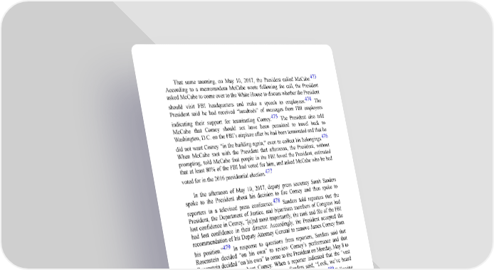 473 That same morning, on May 10, 2017, the President called McCabe. According to a memorandum McCabe wrote following the call, the President asked McCabe to come over to the White House to discuss whether the President 474 should visit FBI headquarters and make a speech to employees. The President said he had received “hundreds” of messages from FBI employees 475 indicating their support for terminating Comey. The President also told McCabe that Comey should not have been permitted to travel back to Washington, D.C. on the FBI’s airplane after he had been terminated and that he 476 did not want Comey “in the building again,“ even to collect his belongings. When McCabe met with the President that afternoon, the President, without prompting, told McCabe that people in the FBI loved the President, estimated that at least 80% of the FBI had voted for him, and asked McCabe who he had 477 voted for in the 2016 presidential election. In the afternoon of May 10, 2017, deputy press secretary Sarah Sanders spoke to the President about his decision to fire Comey and then spoke to 478 reporters in a televised press conference. Sanders told reporters that the President, the Department of Justice, and bipartisan members of Congress had lost confidence in Comey, “[a]nd most importantly, the rank and file of the FBI had lost confidence in their director. Accordingly, the President accepted the recommendation of his Deputy Attorney General to remove James Comey from 479 his position.” In response to questions from reporters, Sanders said that Rosenstein decided “on his own” to review Comey’s performance and that Rosenstein decided “on his own” to come to the President on Monday, May 8 to express his concerns about Comey. When a reporter indicated that the “vast majority” of FBI agents supported Comey, Sanders said, “Look, we’ve heard 480 from countless members of the FBI that say very different things.” Following the press conference, Sanders spoke to the President, who told her she did a good 481 job and did not point out any inaccuracies in her comments. Sanders told this Office that her reference to hearing from “countless members of the FBI” was a 482 “slip of the tongue.” She also recalled that her statement in a separate press interview that rank-and-file FBI agents had lost confidence in Comey was a comment she made “in the heat of the moment” that was not founded on 483 anything. Also on May 10, 2017, Sessions and Rosenstein each spoke to McGahn and