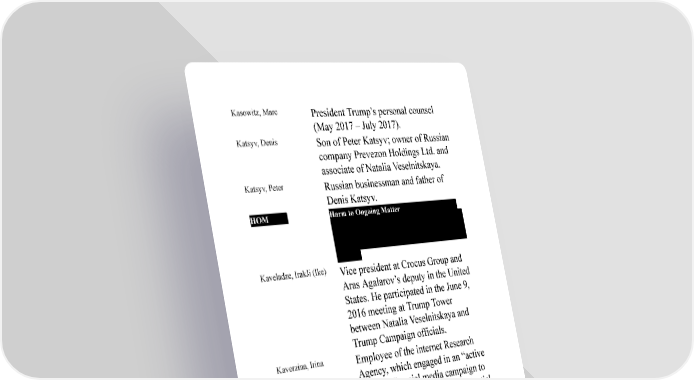 Kasowitz, Marc President Trump’s personal counsel (May 2017 – July 2017). Katsyv, Denis Son of Peter Katsyv; owner of Russian company Prevezon Holdings Ltd. and associate of Natalia Veselnitskaya. Katsyv, Peter Russian businessman and father of Denis Katsyv. HOM█ █ █ Harm to Ongoing Matter█ █ █ █ █ █ █ █ █ █ █ █ █ █ █ █ █ █ █ █ █ █ █ █ █ █ █ █ █ █ █ █ █ █ █ █ █ █ █ █ █ █ █ █ █ █ █ █ █ █ █ █ █ █ █ █ █ █ █ █ █ █ █ █ █ █ █ █ █ █ █ █ █ █ █ █ █ █ █ █ Kaveladze, IrakJi (Ike) Vice president at Crocus Group and Aras Agalarov’s deputy in the United States. He participated in the June 9, 2016 meeting at Trump Tower between Natalia Veselnitskaya and Trump Campaign officials. Kaverzina, Irina Employee of the internet Research Agency, which engaged in an “active measures” social media campaign to interfere in the 2016 U.S. presidential election. Kelly, John White House chief of staff (July 2017 – Jan.2019). Khalilzad, Zalmay U.S. special representative to Afghanistan and former U.S. ambassador. He met with Senator Jeff
