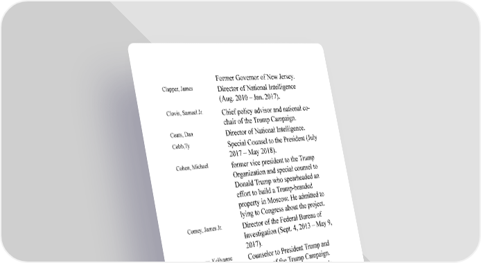 Former Governor of New Jersey. Clapper, James Director of National Intelligence (Aug. 2010 – Jan. 2017). Clovis, Samuel Jr. Chief policy advisor and national co- chair of the Trump Campaign. Coats, Dan Director of National Intelligence. Cobb,Ty Special Counsel to the President (July 2017 – May 2018). Cohen, Michael former vice president to the Trump Organization and special counsel to Donald Trump who spearheaded an effort to build a Trump-branded property in Moscow. He admitted to lying to Congress about the project. Comey, James Jr. Director of the Federal Bureau of Investigation (Sept. 4, 2013 – May 9, 2017). Conway, Kellyanne Counselor to President Trump and manager of the Trump Campaign. Corallo, Mark Spokesman for President Trump’s personal legal team (June 2017 – July 2017). Corsi, Jerome Author and political commentator who formerly worked for WorldNetDaily and InfoWars.Harm to Ongoing Matter█ █ █ █ █ █ █ █ █ █ █ █ █ █ █ █ █ █ █ █ █ █ █ █ █ █ █ █ █ █ █ █ █ █ █ █ █ █ █ █ █ █ █ █ █ █