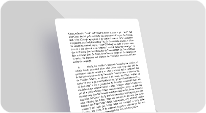 Cohen, refused to “break” and “make up stories in order to get a ‘deal.”’ And after Cohen pleaded guilty to making false statements to Congress, the President said, “what [Cohen]’s trying to do is get a reduced sentence. So he’s lying about a project that everybody knew about.” But the President also appeared to defend the underlying conduct, saying, “Even if [Cohen] was right, it doesn’t matter because I was allowed to do whatever I wanted during the campaign.” As described above, there is evidence that the President knew that Cohen had made false statements about the Trump Tower Moscow project and that Cohen did so to protect the President and minimize the President’s connections to Russia during the campaign. iv. Finally, the President’s statements insinuating that members of Cohen’s family committed crimes after Cohen began cooperating with the government could be viewed as an effort to retaliate against Cohen and chill further testimony adverse to the President by Cohen or others. It is possible that the President believes, as reflected in his tweets, that Cohen “ma[d]e[] up stories” in order to get a deal for himself and “get his wife and father-in-law . . . off Scott Free.” It also is possible that the President’s mention of Cohen’s wife and father-in-law were not intended to affect Cohen as a witness but rather were part of a public-relations strategy aimed at discrediting Cohen and deflecting attention away from the President on Cohen-related matters. But the President’s suggestion that Cohen’s family members committed crimes happened more than once, including just before Cohen was sentenced (at the same time as the President stated that Cohen “should, in my opinion, serve a full and complete sentence”) and again just before Cohen was scheduled to testify before Congress. The timing of the statements supports an inference that they were intended at least in part to discourage Cohen from further cooperation. L. Overarching Factual Issues Although this report does not contain a traditional prosecution decision or declination decision, the evidence supports several general conclusions relevant to analysis of the facts concerning the President’s course of conduct. 1. Three features of this case render it atypical compared to the heartland obstruction-of-justice prosecutions brought by the Department of Justice. First, the conduct involved actions by the President. Some of the conduct did not implicate the President’s constitutional authority and raises garden-