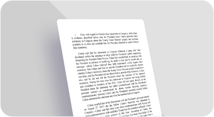 i. First, with regard to Cohen’s false statements to Congress, while there is evidence, described below, that the President knew Cohen provided false testimony to Congress about the Trump Tower Moscow project, the evidence available to us does not establish that the President directed or aided Cohen’s false testimony. Cohen said that his statements to Congress followed a “party line” that developed within the campaign to align with the President’s public statements distancing the President from Russia. Cohen also recalled that, in speaking with the President in advance of testifying, he made it clear that he would stay on message—which Cohen believed they both understood would require false testimony. But Cohen said that he and the President did not explicitly discuss whether Cohen’s testimony about the Trump Tower Moscow project would be or was false, and the President did not direct him to provide false testimony. Cohen also said he did not tell the President about the specifics of his planned testimony. During the time when his statement to Congress was being drafted and circulated to members of the JDA, Cohen did not speak directly to the President about the statement, but rather communicated with the President’s personal counsel—as corroborated by phone records showing extensive communications between Cohen and the President’s personal counsel before Cohen submitted his statement and when he testified before Congress. Cohen recalled that in his discussions with the President’s personal counsel on August 27, 2017—the day before Cohen’s statement was submitted to Congress—Cohen said that there were more communications with Russia and more communications with candidate Trump than the statement reflected. Cohen recalled expressing some concern at that time. According to Cohen, the President’s personal counsel—who did not have first-hand knowledge of the project—responded by saying that there was no need to muddy the water, that it was unnecessary to include those details because the project did not take place, and that Cohen should keep his statement short and tight, not elaborate, stay on message, and not contradict the President. Cohen’s recollection of the content of those conversations is consistent with direction about the substance of Cohen’s draft statement that appeared to come from members of the JDA. For example, Cohen omitted any reference to his outreach to Russian government officials to set up a meeting between Trump and Putin during the United Nations General Assembly, and Cohen believed it was a decision of the JDA to delete the sentence, “The building project led me to make limited contacts with Russian government officials.”