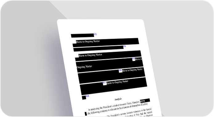 903 █ █ █ █ █ █ █ █ █ █ █ Harm to Ongoing Matter█ █ █ █ █ █ █ █ █ █ █ █ █ █ █ █ █ █ █ █ █ █ █ █ █ █ █ █ █ █ █ █ █ █ █ █ █ █ █ █ █ █ █ █ █ █ █ █ █ █ █ █ █ █ █ 904 █ █ █ █ █ █ █ █ █ █ █ █ █ █ █ █ █ █ █ █ █ █ █ █ █ Harm to Ongoing Matter█ █ █ █ █ █ █ █ █ █ █ █ █ █ █ █ █ █ █ █ █ █ █ █ █ █ █ █ █ █ █ █ █ █ █ █ █ █ █ █ █ █ █ █ █ █ █ █ █ █ █ █ █ █ █ 905 █ █ █ █ █ █ █ █ █ █ █ █ █ █ █ █ █ █ █ █ █ █ █ █ █ Harm to Ongoing Matter█ █ █ █ █ █ █ █ █ █ █ █ █ █ █ █ █ █ █ █ █ █ █ █ █ █ █ █ █ █ █ █ █ █ █ █ █ █ █ █ █ █ █ █ █ █ █ █ █ █ █ █ █ █ █ █ █ █ █ █ 906 █ █ █ █ █ █ █ █ █ █ █ █ █ █ █ █ █ █ █ █ Harm to Ongoing Matter█ █ █ █ █ █ █ █ █ █ █ █ █ █ █ █ █ █ █ █ █ █ █ █ █ █ █ █ █ █ █ █ █ █ █ █ █ █ █ █ █ █ █ █ █ █ █ █ █ █ █ █ █ █ █ █ █ █ █ █ █ █ █ █ █ █ █ █ █ 907 █ █ █ █ █ █ █ █ █ █ █ Harm to Ongoing Matter█ █ █ █ █ █ █ █ █ █ █ █ █ █ █ █ █ █ █ █ █ █ █ █ █ █ █ █ █ █ █ █ █ █ █ █ █ █ █ █ █ █ █ █ █ █ █ █ █ █ █ █ █ █ █ █ █ █ █ █ █ █ █ █ █ █ █ █ █ █ █ █ █ █ █ █ █ █ 908 █ █ Analysis In analyzing the President’s conduct towards Flynn, Manafort, HOM█ █ █ █, the following evidence is relevant to the elements of obstruction of justice: a. Obstructive act. The President’s actions towards witnesses in the Special Counsel’s investigation would qualify as obstructive if they had the natural tendency to prevent particular witnesses from testifying truthfully, or otherwise would have the probable effect of influencing, delaying, or preventing their testimony to law enforcement. With regard to Flynn, the President sent private and public messages to Flynn encouraging him to stay strong and conveying that the President still cared about him before he began to cooperate with the government. When Flynn’s attorneys withdrew him from a joint defense agreement with the President, signaling that Flynn was potentially cooperating with the government, the President’s personal counsel initially reminded Flynn’s counsel of the President’s warm feelings towards Flynn and said “that still remains.” But when Flynn’s