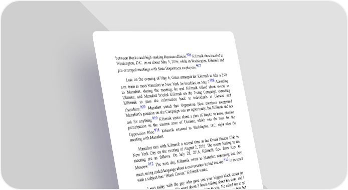 906 between Boyko and high-ranking Russian officials. Kilimnik then traveled to Washington, D.C. on or about May 5, 2016; while in Washington, Kilimnik had 907 pre-arranged meetings with State Department employees. Late on the evening of May 6, Gates arranged for Kilimnik to take a 3:00 908 a.m. train to meet Manafort in New York for breakfast on May 7. According to Manafort, during the meeting, he and Kilimnik talked about events in Ukraine, and Manafort briefed Kilimnik on the Trump Campaign, expecting Kilimnik to pass the information back to individuals in Ukraine and 909 elsewhere. Manafort stated that Opposition Bloc members recognized Manafort’s position on the Campaign was an opportunity, but Kilimnik did not 910 ask for anything. Kilimnik spoke about a plan of Boyko to boost election participation in the eastern zone of Ukraine, which was the base for the 911 Opposition Bloc. Kilimnik returned to Washington, D.C. right after the meeting with Manafort. Manafort met with Kilimnik a second time at the Grand Havana Club in New York City on the evening of August 2, 2016. The events leading to the meeting are as follows. On July 28, 2016, Kilimnik flew from Kiev to 912 Moscow. The next day, Kilimnik wrote to Manafort requesting that they 913 meet, using coded language about a conversation he had that day. In an email with a subject line “Black Caviar,” Kilimnik wrote: I met today with the guy who gave you your biggest black caviar jar several years ago. We spent about 5 hours talking about his story, and I have several important messages from him to you. He asked me to go and brief you on our conversation. I said I have to run it by you first, but in principle I am prepared to do it. . . . It has to do about the future of his 914 country, and is quite interesting. Manafort identified “the guy who gave you your biggest black caviar jar” as Yanukovych. He explained that, in 2010, he and Yanukovych had lunch to celebrate the recent presidential election. Yanukovych gave Manafort a large jar 915 of black caviar that was worth approximately $30,000 to $40,000. Manafort’s identification of Yanukovych as “the guy who gave you your biggest black caviar jar” is consistent with Kilimnik being in Moscow—where