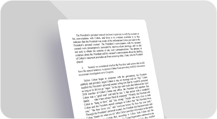 The President’s personal counsel declined to provide us with his account of his conversations with Cohen, and there is no evidence available to us that indicates that the President was aware of the information Cohen provided to the President’s personal counsel. The President’s conversations with his personal counsel were presumptively protected by attorney-client privilege, and we did not seek to obtain the contents of any such communications. The absence of evidence about the President and his counsel’s conversations about the drafting of Cohen’s statement precludes us from assessing what, if any, role the President played. ii. Second, we considered whether the President took actions that would have the natural tendency to prevent Cohen from providing truthful information to criminal investigators or to Congress. Before Cohen began to cooperate with the government, the President publicly and privately urged Cohen to stay on message and not “flip.” Cohen recalled the President’s personal counsel telling him that he would be protected so long as he did not go “rogue.” In the days and weeks that followed the April 2018 searches of Cohen’s home and office, the President told reporters that Cohen was a “good man” and said he was “a fine person with a wonderful family . . . who I have always liked & respected.” Privately, the President told Cohen to “hang in there” and “stay strong.” People who were close to both Cohen and the President passed messages to Cohen that “the President loves you,” “the boss loves you,” and “everyone knows the boss has your back.” Through the President’s personal counsel, the President also had previously told Cohen “thanks for what you do” after Cohen provided information to the media about payments to women that, according to Cohen, both Cohen and the President knew was false. At that time, the Trump Organization continued to pay Cohen’s legal fees, which was important to Cohen. Cohen also recalled discussing the possibility of a pardon with the President’s personal counsel, who told him to stay on message and everything would be fine. The President indicated in his public statements that a pardon had not been ruled out, and also stated publicly that “[m]ost people will flip if the Government lets them out of trouble” but that he “d[idn‘t] see Michael doing that.” After it was reported that Cohen intended to cooperate with the government, however, the President accused Cohen of “mak[ing] up stories in order to get himself out of an unrelated jam (Taxi cabs maybe?),” called Cohen a “rat,” and on multiple occasions publicly suggested that Cohen’s family members had