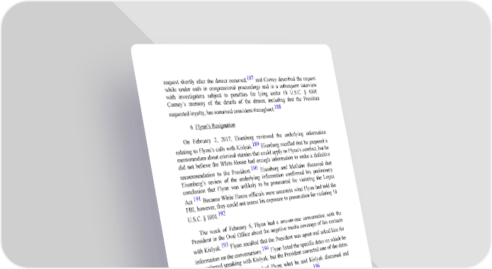 187 request shortly after the dinner occurred; and Comey described the request while under oath in congressional proceedings and in a subsequent interview with investigators subject to penalties for lying under 18 U.S.C. § 1001. Comey’s memory of the details of the dinner, including that the President 188 requested loyalty, has remained consistent throughout. 6. Flynn’s Resignation On February 2, 2017, Eisenberg reviewed the underlying information 189 relating to Flynn’s calls with Kislyak. Eisenberg recalled that he prepared a memorandum about criminal statutes that could apply to Flynn’s conduct, but he did not believe the White House had enough information to make a definitive 190 recommendation to the President. Eisenberg and McGahn discussed that Eisenberg’s review of the underlying information confirmed his preliminary conclusion that Flynn was unlikely to be prosecuted for violating the Logan 191 Act. Because White House officials were uncertain what Flynn had told the FBI, however, they could not assess his exposure to prosecution for violating 18 192 U.S.C. § 1001. The week of February 6, Flynn had a one-on-one conversation with the President in the Oval Office about the negative media coverage of his contacts 193 with Kislyak. Flynn recalled that the President was upset and asked him for 194 information on the conversations. Flynn listed the specific dates on which he remembered speaking with Kislyak, but the President corrected one of the dates 195 he listed. The President asked Flynn what he and Kislyak discussed and 196 Flynn responded that he might have talked about sanctions. On February 9, 2017, the Washington Post reported that Flynn discussed 197 sanctions with Kislyak the month before the President took office. After the publication of that story, Vice President Pence learned of the Department of 198 Justice’s notification to the White House about the content of Flynn’s calls. He and other advisors then sought access to and reviewed the underlying 199 information about Flynn’s contacts with Kislyak. FBI Deputy Director Andrew McCabe, who provided the White House officials access to the information and was present when they reviewed it, recalled the officials asking