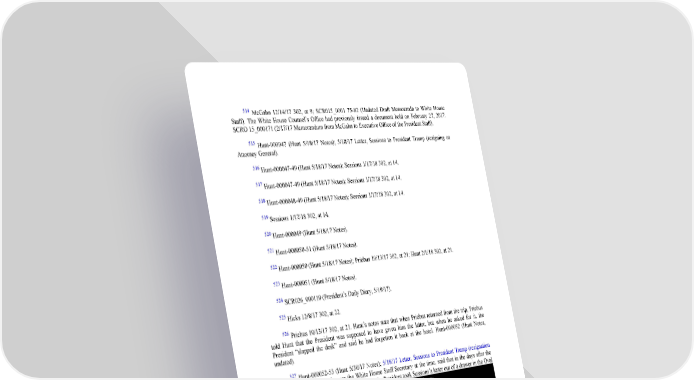 514 McGahn 12/14/17 302, at 9; SCR015_0001 75-82 (Undated Draft Memoranda to White House Staff). The White House Counsel’s Office had previously issued a document hold on February 27, 2017. SCRO 15_000171 (2/17/17 Memorandum from McGahn to Executive Office of the President Staff). 515 Hunt-000047 (Hunt 5/18/17 Notes); 5/18/17 Letter, Sessions to President Trump (resigning as Attorney General). 516 Hunt-000047-49 (Hunt 5/18/17 Notes); Sessions 1/17/18 302, at 14. 517 Hunt-000047-49 (Hunt 5/18/17 Notes); Sessions 1/17/18 302, at 14. 518 Hunt-000048-49 (Hunt 5/18/17 Notes); Sessions 1/17/18 302, at 14. 519 Sessions 1/17/18 302, at 14. 520 Hunt-000049 (Hunt 5/18/17 Notes). 521 Hunt-000050-51 (Hunt 5/18/17 Notes). 522 Hunt-000050 (Hunt 5/18/17 Notes); Priebus 10/13/17 302, at 21; Hunt 2/1/18 302, at 21. 523 Hunt-000051 (Hunt 5/18/17 Notes). 524 SCR026_000110 (President’s Daily Diary, 5/19/17). 525 Hicks 12/8/17 302, at 22. 526 Priebus 10/13/17 302, at 21. Hunt’s notes state that when Priebus returned from the trip, Priebus told Hunt that the President was supposed to have given him the letter, but when he asked for it, the President “slapped the desk” and said he had forgotten it back at the hotel. Hunt-000052 (Hunt Notes, undated). 527 Hunt-000052-53 (Hunt 5/30/17 Notes); 5/18/17 Letter, Sessions to President Trump (resignation letter). Robert Porter, who was the White House Staff Secretary at the time, said that in the days after the President returned from the Middle East trip, the President took Sessions’s letter out of a drawer in the Oval Office and showed it to Porter. Porter 4/13/18 302, at 8. Personal Privacy█ █ █ █ █ █ █ █ █ █ █ █ █ █ █ █ █ █ █ █ █ █ █ █ █ █ █ █ █ █ █ █ █ █ █ █ █ █ █ █ █ █ █ █ █ █ █ █ █ █ █ █ █ █ █ █ █ █ █ █ █ █ █ █ █ █ █ ███ 528 Priebus 1/18/18 302, at 12; Bannon 2/14/18 302, at 10; McGahn 3/8/18 302, at I; McGahn 12/14/17 302, at 10; Bannon 10/26/18 302, at 12. 529 Priebus 1/18/18 302, at 12; Bannon 2/14/18 302, at 10. In October 2011, Mueller resigned his family’s membership from Trump National Golf Club in Sterling, Virginia, in a letter that noted that “we live in the District and find that we are unable to make full use of the Club” and that inquired “whether we would be entitled to a refund of a portion of our initial membership fee,” which was paid in 1994. 10/12/11 Letter, Muellers to Trump National Golf Club (IAEN). About two weeks later, the controller of the club responded that the Muellers’ resignation would be effective October 31, 2011, and that they would be “placed on a waitlist to be refunded on a first resigned / first refunded basis” in accordance with the club’s