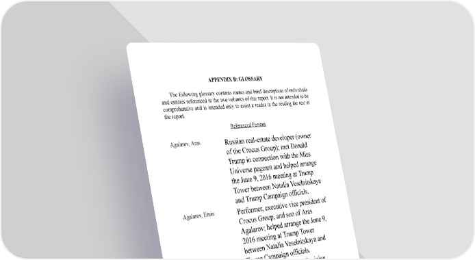 APPENDIX B: GLOSSARY The following glossary contains names and brief descriptions of individuals and entities referenced in the two volumes of this report. It is not intended to be comprehensive and is intended only to assist a reader in the reading the rest of the report. Referenced Persons Agalarov, Aras Russian real-estate developer (owner of the Crocus Group); met Donald Trump in connection with the Miss Universe pageant and helped arrange the June 9, 2016 meeting at Trump Tower between Natalia Veselnitskaya and Trump Campaign officials. Agalarov, Emin Performer, executive vice president of Crocus Group, and son of Aras Agalarov; helped arrange the June 9, 2016 meeting at Trump Tower between Natalia Veselnitskaya and Trump Campaign officials. Akhmetov, Rinat Former member in the Ukrainian parliament who hired Paul Manafort to conduct work for Ukrainian political party, the Party of Regions. Akhmetshin, Rinat U.S. lobbyist and associate of Natalia Veselnitskaya who attended the June 9, 2016 meeting at Trump Tower between Veselnitskaya and Trump