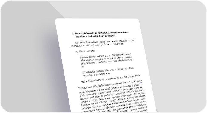 A. Statutory Defenses to the Application of Obstruction-Of-Justice Provisions to the Conduct Under Investigation The obstruction-of-justice statute most readily applicable to our investigation is 18 U.S.C. § 1512(c)(2). Section 1512(c) provides: (c) Whoever corruptly— (1) alters, destroys, mutilates, or conceals a record, document, or other object, or attempts to do so, with the intent to impair the object’s integrity or availability for use in an official proceeding; or (2) otherwise obstructs, influences, or impedes any official proceeding, or attempts to do so, shall be fined under this title or imprisoned not more than 20 years, or both. The Department of Justice has taken the position that Section 1512(c)(2) states a 1077 broad, independent, and unqualified prohibition on obstruction of justice. While defendants have argued that subsection (c)(2) should be read to cover only acts that would impair the availability or integrity of evidence because that is subsection (c)(l)’s focus, strong arguments weigh against that proposed limitation. The text of Section 1512(c)(2) confirms that its sweep is not tethered to Section 1512(c)(1); courts have so interpreted it; its history does not counsel otherwise; and no principle of statutory construction dictates a contrary view. On its face, therefore, Section 1512(c)(2) applies to all corrupt means of obstructing a proceeding, pending or contemplated—including by improper exercises of official power. In addition, other statutory provisions that are potentially applicable to certain conduct we investigated broadly prohibit obstruction of proceedings that are pending before courts, grand juries, and Congress. See 18 U.S.C. §§ 1503, 1505. Congress has also specifically prohibited witness tampering. See 18 U.S.C. § 1512(b). 1. The Text of Section 1512(c)(2) Prohibits a Broad Range of Obstructive Acts Several textual features of Section 1512(c)(2) support the conclusion that the provision broadly prohibits corrupt means of obstructing justice and is not
