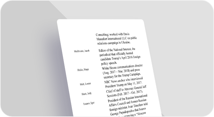 Consulting; worked with Davis Manafort International LLC on public relations campaign in Ukraine. Heilbrunn, Jacob Editor of the National Interest, the periodical that officially hosted candidate Trump’s April 2016 foreign policy speech. Hicks, Hope White House communications director (Aug. 2017 – Mar. 2018) and press secretary for the Trump Campaign. Holt, Lester NBC News anchor who interviewed President Trump on May 11, 2017. Hunt, Jody Chief of staff to Attorney General Jeff Sessions (Feb. 2017 – Oct. 2017). Ivanov, Igor President of the Russian International Affairs Council and former Russian foreign minister. Ivan Timofeev told George Papadopoulos that Ivanov advised on arranging a “Moscow visit” for the Trump Campaign. Ivanov, Sergei Special representative of Vladimir Putin, former Russian deputy prime minister, and former FSB deputy director. In January 2016, Michael Cohen emailed the Kremlin requesting to speak to Ivanov.