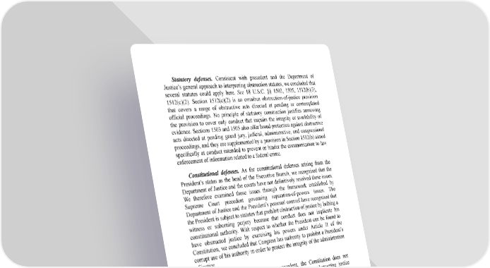 Statutory defenses. Consistent with precedent and the Department of Justice’s general approach to interpreting obstruction statutes, we concluded that several statutes could apply here. See 18 U.S.C. §§ 1503, 1505, 1512(b)(3), 1512(c)(2). Section 1512(c)(2) is an omnibus obstruction-of-justice provision that covers a range of obstructive acts directed at pending or contemplated official proceedings. No principle of statutory construction justifies narrowing the provision to cover only conduct that impairs the integrity or availability of evidence. Sections 1503 and 1505 also offer broad protection against obstructive acts directed at pending grand jury, judicial, administrative, and congressional proceedings, and they are supplemented by a provision in Section 1512(b) aimed specifically at conduct intended to prevent or hinder the communication to law enforcement of information related to a federal crime. Constitutional defenses. As for constitutional defenses arising from the President’s status as the head of the Executive Branch, we recognized that the Department of Justice and the courts have not definitively resolved these issues. We therefore examined those issues through the framework established by Supreme Court precedent governing separation-of-powers issues. The Department of Justice and the President’s personal counsel have recognized that the President is subject to statutes that prohibit obstruction of justice by bribing a witness or suborning perjury because that conduct does not implicate his constitutional authority. With respect to whether the President can be found to have obstructed justice by exercising his powers under Article II of the Constitution, we concluded that Congress has authority to prohibit a President’s corrupt use of his authority in order to protect the integrity of the administration of justice. Under applicable Supreme Court precedent, the Constitution does not categorically and permanently immunize a President for obstructing justice through the use of his Article II powers. The separation-of-powers doctrine authorizes Congress to protect official proceedings, including those of courts and grand juries, from corrupt, obstructive acts regardless of their source. We also concluded that any inroad on presidential authority that would occur from prohibiting corrupt acts does not undermine the President’s ability to fulfill his constitutional mission. The term “corruptly” sets a demanding standard. It requires a concrete showing that a person acted with an intent to obtain an improper advantage for himself or someone else, inconsistent with official duty and the rights of others. A preclusion of “corrupt” official action does not diminish the President’s ability to exercise Article II powers. For example, the