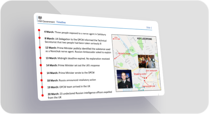 Timeline Slide 1 4 March: Three people exposed to a nerve agent in Salisbury 200m KEY LOCATIONS 8 March: UK Delegation to the OPCW informed the Technical Secretariat that two people had been taken seriously ill 12 March: Prime Minister publicly identified the substance used as a Novichok nerve agent. Russian Ambassador asked to explain Skripal’s house 13 March: Midnight deadline expired. No explanation received 14 March: Prime Minister set out the UK’s response 14 March: Prime Minister wrote to the OPCW Zizzi restaurant Shopping centre 18 March: Russia announced retaliatory action 19 March: OPCW team arrived in the UK Bishop’s Mill pub 20 March: 23 undeclared Russian intelligence officers expelled from the UK