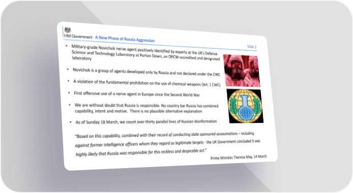 A New Phase of Russia Aggression Slide 2 • Military-grade Novichok nerve agent positively identified by experts at the UK’s Defence Science and Technology Laboratory at Porton Down, an OPCW-accredited and designated laboratory • Novichok is a group of agents developed only by Russia and not declared under the CWC • A violation of the fundamental prohibition on the use of chemical weapons (Art. 1 CWC) • First offensive use of a nerve agent in Europe since the Second World War • We are without doubt that Russia is responsible. No country bar Russia has combined capability, intent and motive. There is no plausible alternative explanation • As of Sunday 18 March, we count over thirty parallel lines of Russian disinformation “Based on this capability, combined with their record of conducting state sponsored assassinations – including against former intelligence officers whom they regard as legitimate targets - the UK Government concluded it was highly likely that Russia was responsible for this reckless and despicable act.” Prime Minister Theresa May, 14 March